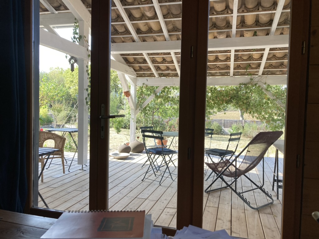 Terrasse couverte et semi couverte (+- 85 m2 ) en bois, côté jardin devant (sud-ouest) La terrasse arrière (nord-est) carrelée de 136 m2 (17 x 8 mètres), avec partie dédiée aux cuissons Raku, four et matériel d’enfumage sous bâches.