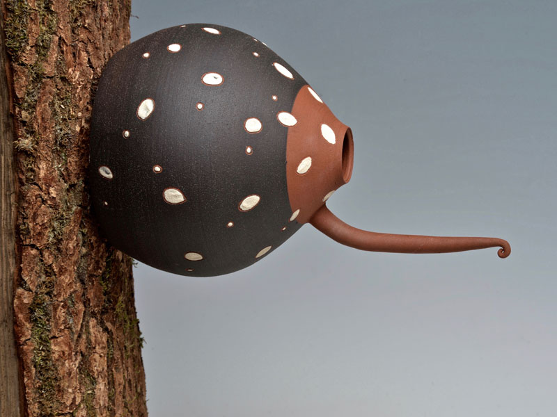 Nichoirs, mangeoires, abreuvoirs pour les oiseaux, supensions de plantes, arrosoirs Chantepleures, déco-tuteurs,... pièces en grès non gélif aux décors aux engobes naturels
